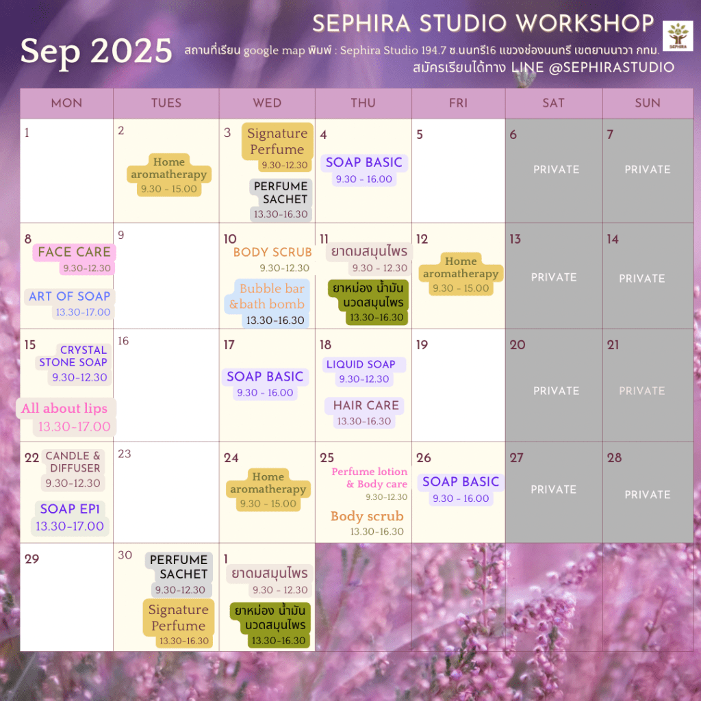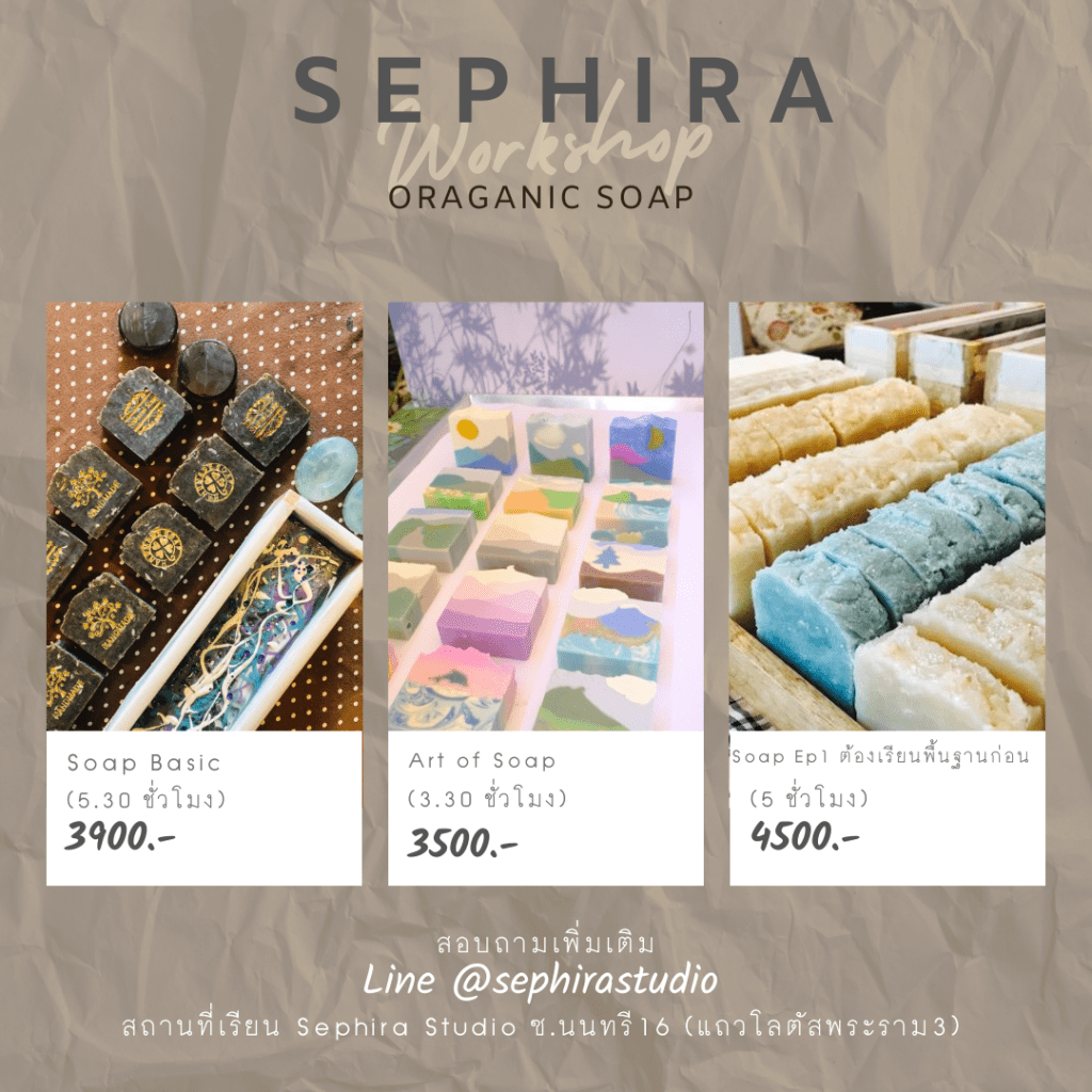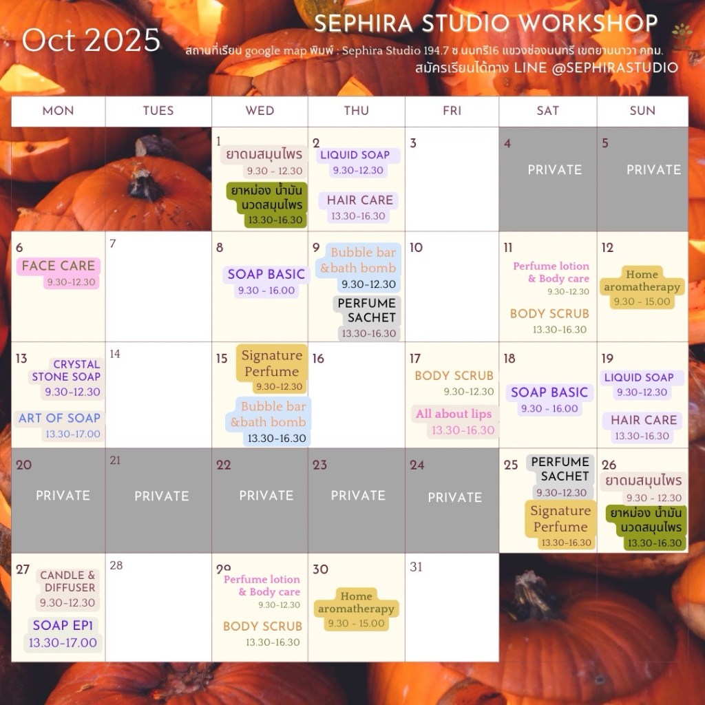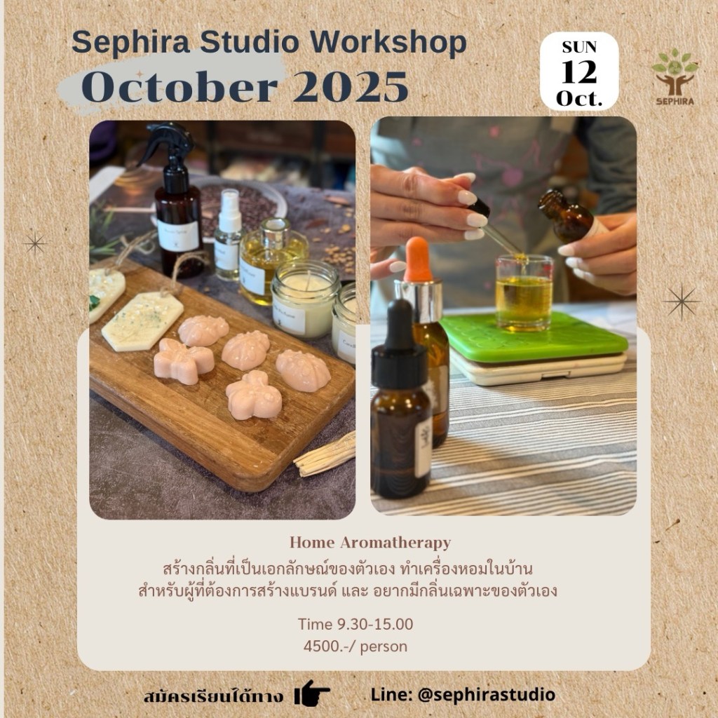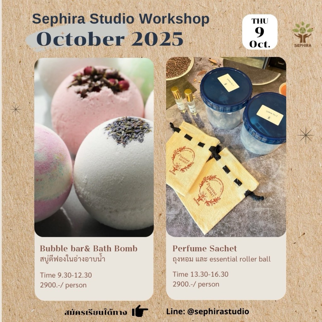 หากคุณกำลังมองหาคอร์สเรียนเพื่อพัฒนาทักษะด้าน การทำสบู่ เครื่องหอม และเครื่องสำอางจากสมุนไพรธรรมชาติ Sephira Studio ได้จัด Workshop เดือนตุลาคม 2025 ให้คุณเลือกเรียนหลากหลายหัวข้อ