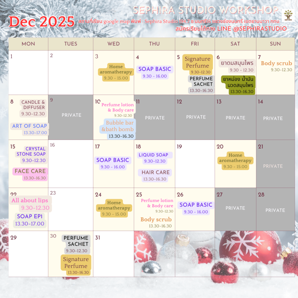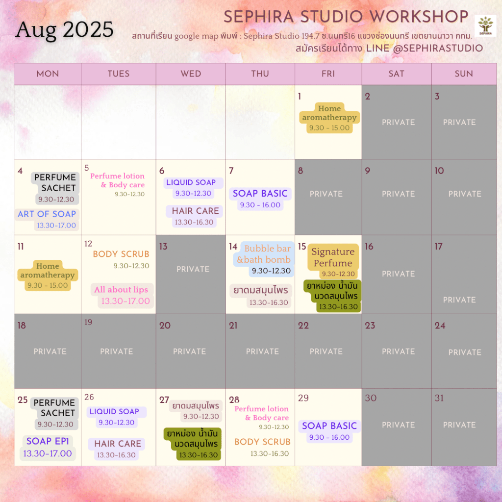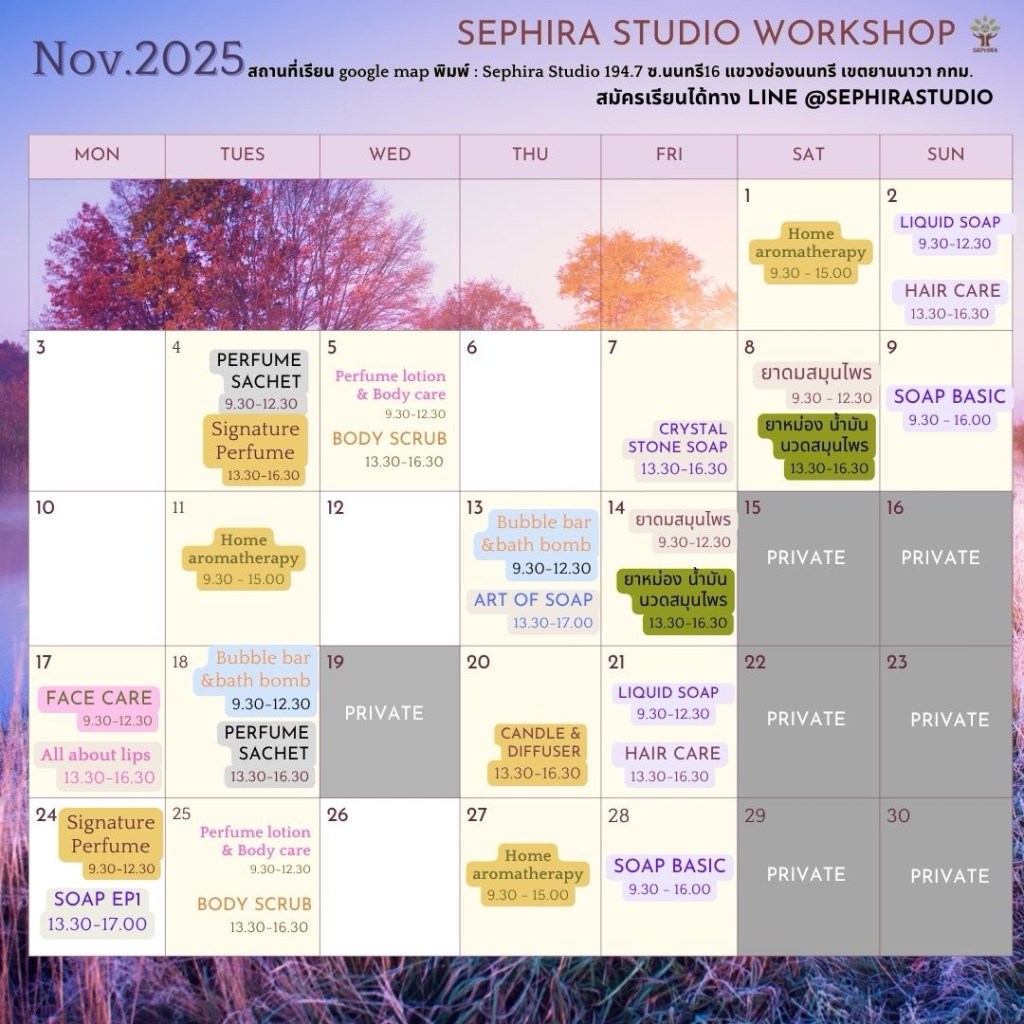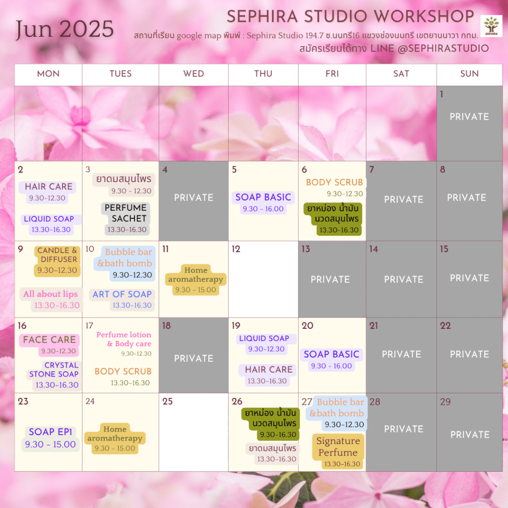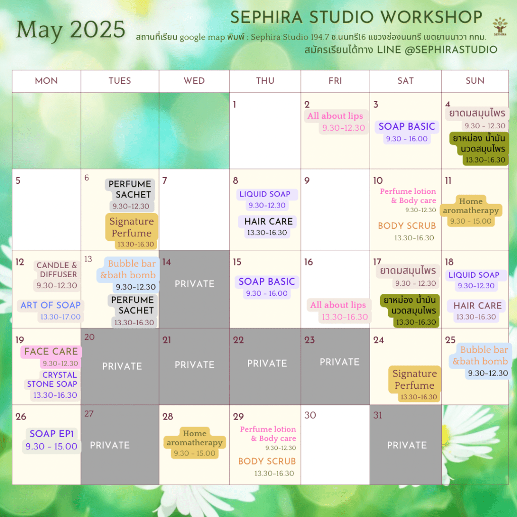 หากคุณกำลังมองหาคอร์สเรียนเพื่อพัฒนาทักษะด้าน การทำสบู่ เครื่องหอม และเครื่องสำอางจากสมุนไพรธรรมชาติ Sephira Studio ได้จัด Workshop เดือนตุลาคม 2025 ให้คุณเลือกเรียนหลากหลายหัวข้อ