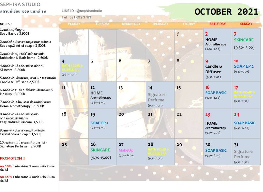 ตารางสอนเดือน ตุลาคม 2564 Sephira Studio
