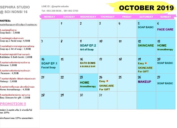ตารางสอน Workshop Sephira เดือน ตุลาคม 2562