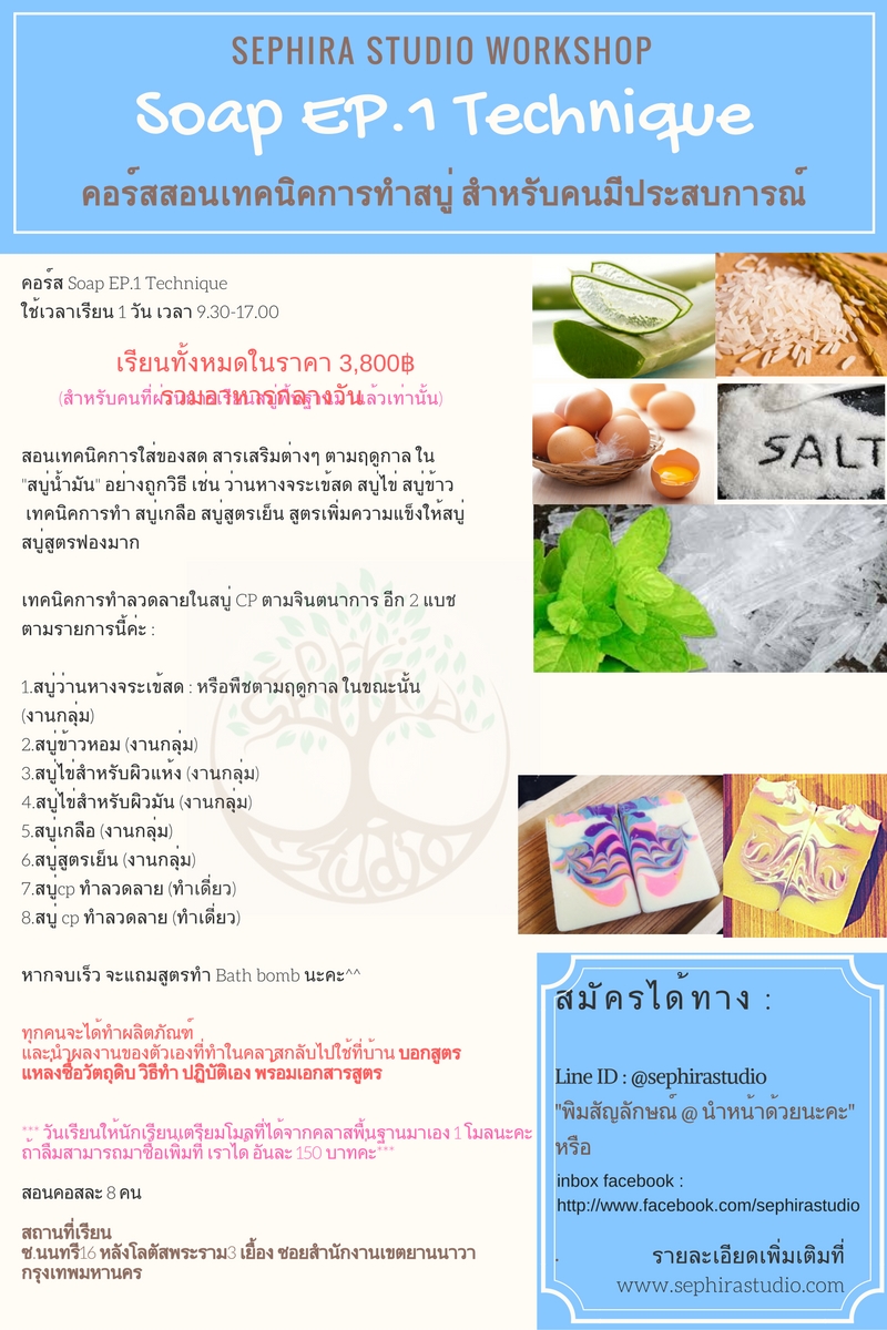 Workshop Handmade Soap and skincare : สอนทำสบู่ และ ผลิตภัณฑ์บำรุงผิว จากวัตถุดิบธรรมชาติ : Line ID : @sephirastudio : Tel. 081-6923783 : E-mail: sephirashop@yahoo.com : www.facebook.com/sephirastudio : www.sephirastudio.com