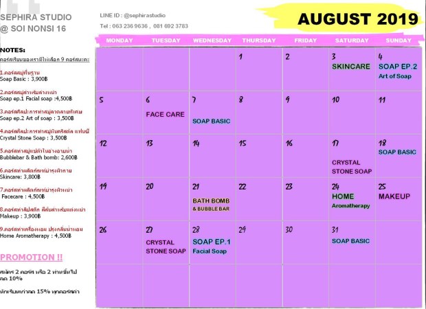 ตาราง Sephira Studio Workshop เดือนสิงหาคม 2562 ❤️